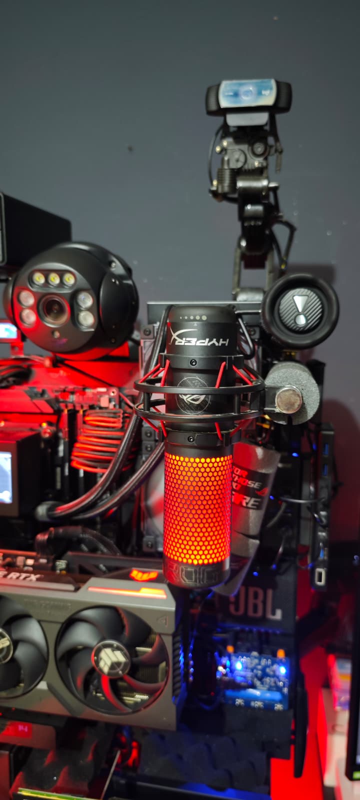 As seen in the heart of the build, we utilize a HyperX QuadCast (custom-branded with ROG aesthetics) to ensure voice clarity matches the high-end visuals.